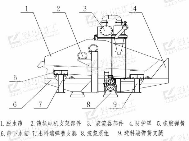 脫水部分:由振動電機和脫水篩組成,洗砂機的成品物料直接進入脫水篩進行二次清洗、分級和脫水。