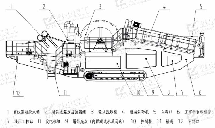 結(jié)構(gòu)組成:履帶式移動洗砂機(jī)由篩分裝置、水洗裝置、脫水回收裝置、泵及電機(jī)組件、傳送皮帶、電控及液壓系統(tǒng)等組成。